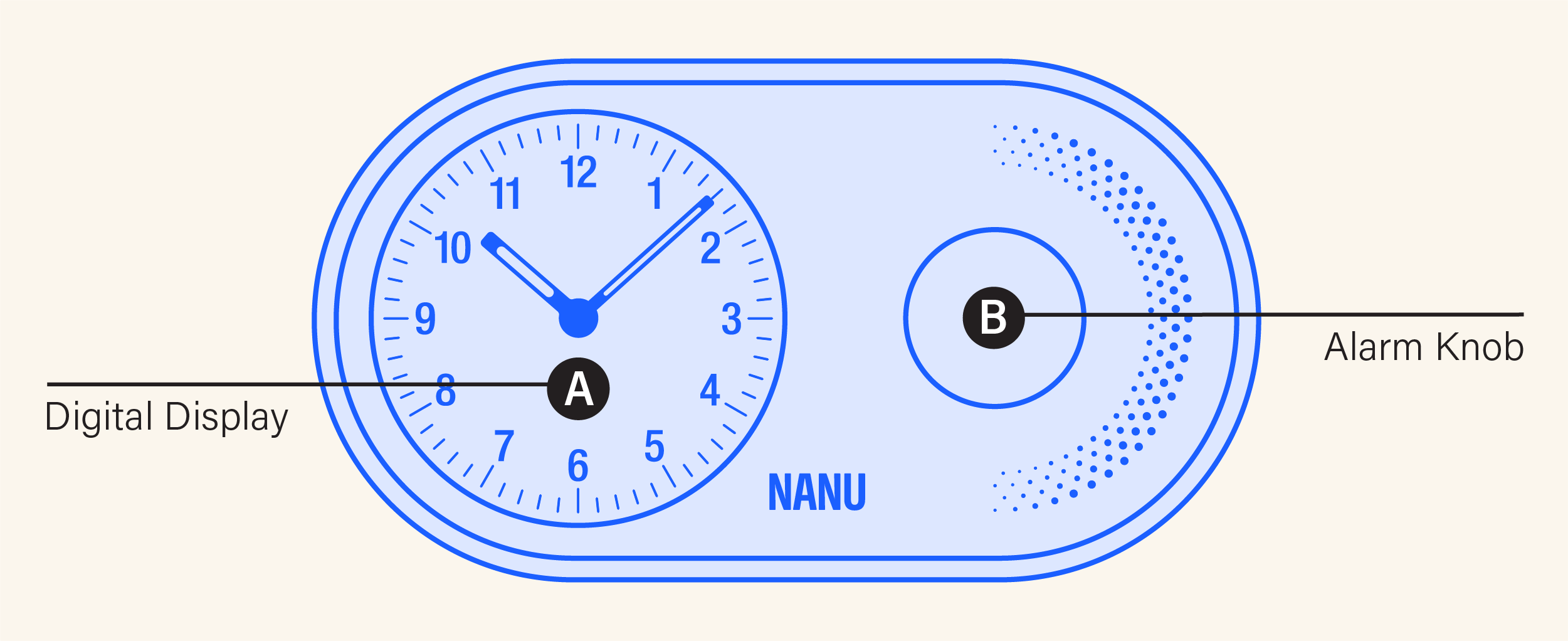 With the bell icon visible on the Digital Display (A), short press the Alarm Knob (B) to view the set alarm time. If you wish to change the alarm time, rotate the Alarm Knob left or right to reach your preferred time, then short press the Alarm Knob to confirm your selection and exit the setting.