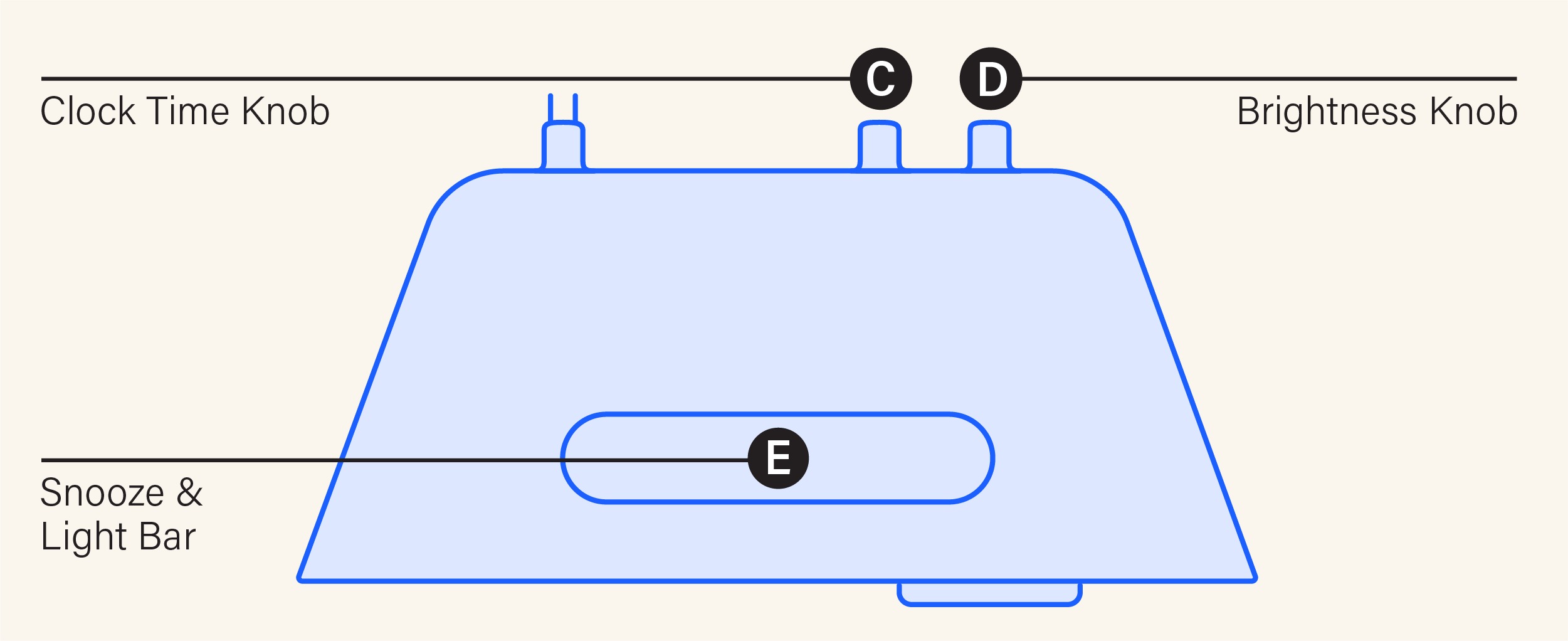Top View: (C) Clock Time Knob (D) Brightness Knob (E) Snooze and Light Bar