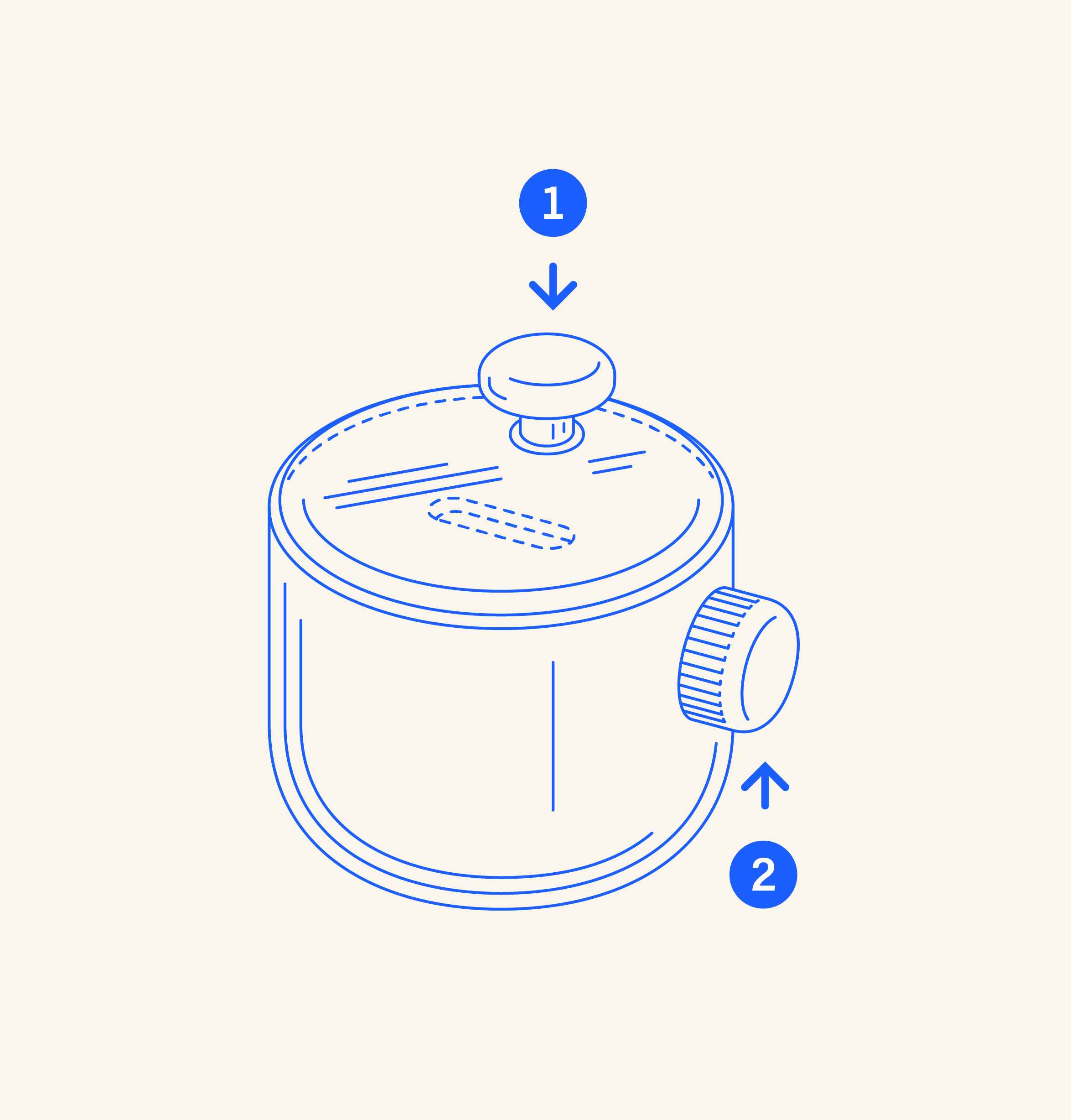 Front View: (1) Push Button (2) Reset Knob